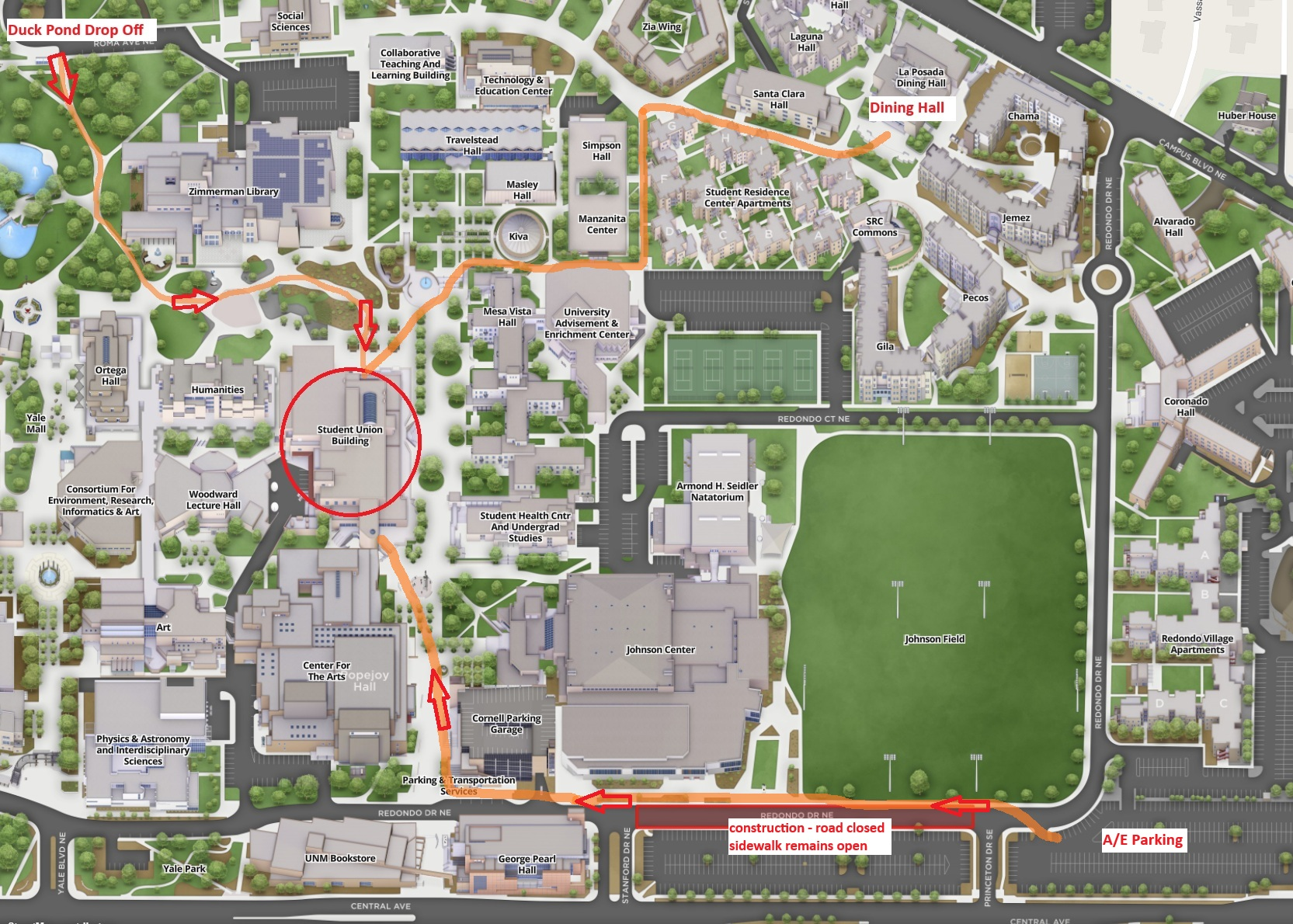 This map shows road closures on campus near A/E parking lot (bottom). The sidewalk is fine for walking. It also shows the walking path from the duck pond to the SUB (top left), as well as the walking path from the SUB to the La Posada Dining Hall (top right).